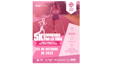Cada paso cuenta cuando se corre por una causa que salva vidas, por lo que el Sistema DIF-Reynosa, que preside Carlos Luis Peña Garza y el Voluntariado que encabeza Alejandra Yelitza Garza, en coordinación con el Instituto Municipal del Deporte, invitan a la ciudadanía a participar en la Carrera 5K “Corriendo por la Vida”, que se llevará a cabo este próximo sábado 25 de octubre, a las 7:00 de la mañana, con punto de partida en el Museo del Ferrocarril, ubicado en la zona centro de Reynosa.